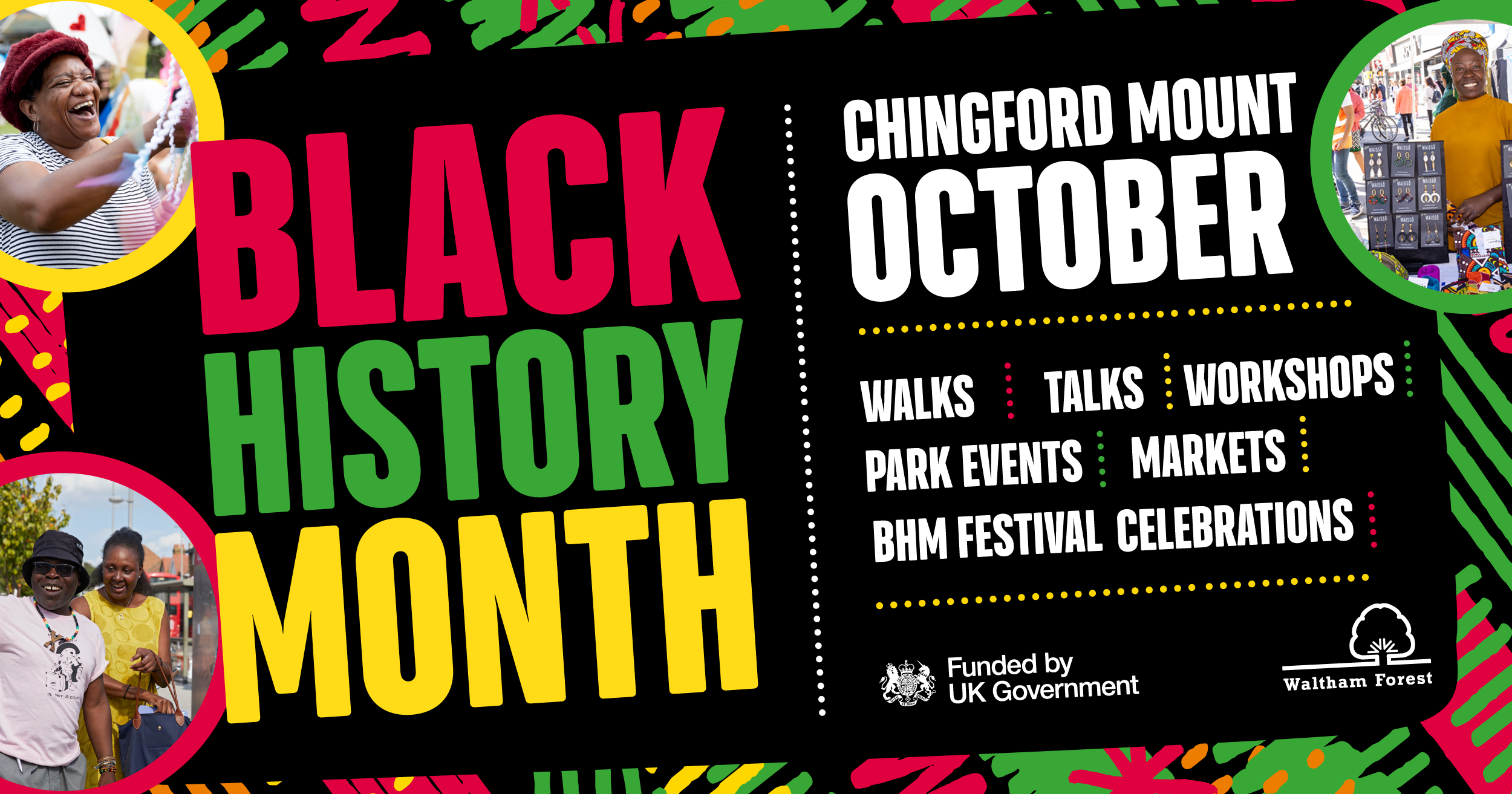 Join us for an exciting month long programme of events, workshops, pop-up markets, park events, exhibitions, walks, talks and plenty more, being delivered as part of the first ever Chingford Mount Black History Month programme.