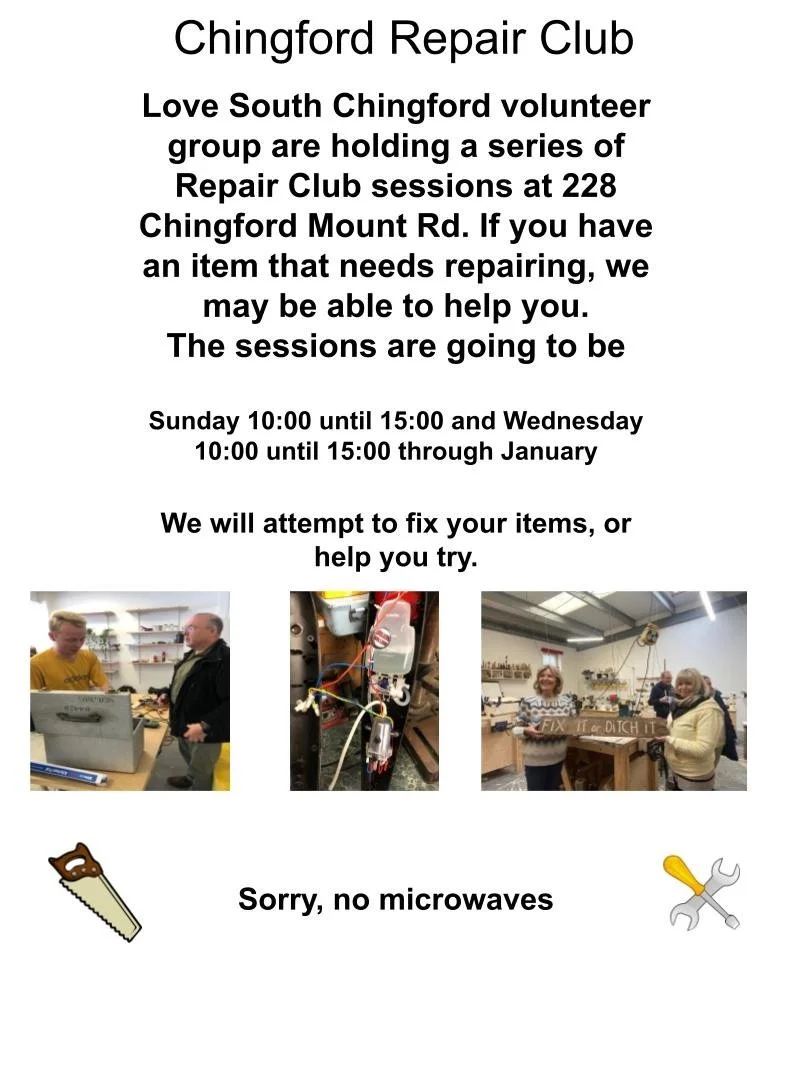 The Love South Chingford volunteer group are holding a series of Repair Club sessions at 228 Chingford Mount Road throughout January 2025.