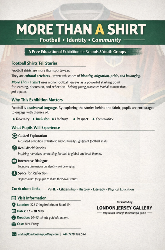 Back to All Events More than a Shirt: a unique exhibition Sunday 17 May 2026 09:00 Saturday 30 May 2026 17:00 Google Calendar ICS Join the London Jersey Gallery for a unique exhibition, looking at the deeper meaning and association of football shirts and their links to identity, migration, pride and identity.
